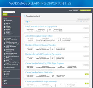 On the Work-Based Learning page, you can browse opportunities posted by your school. Use the filters on the left-hand side to narrow the list. You can filter based on Type, Career Category, Location, and whether an opportunity is paid.