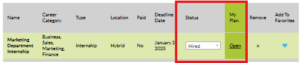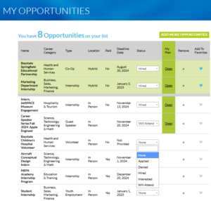 On the My Opportunities page, you can manage your opportunities by updating the status. Changing an opportunity’s status to Hired or Will Attend will populate the My Plan column and an Open option will appear. Clicking the heart icon will favorite the opportunity and pin it to the top of the list.