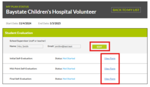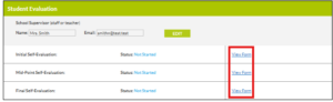 For the Student Evaluations: First, add your School Supervisor to your forms by clicking Edit within the School Supervisor box and entering that person’s name and email address. Next to each Self-Evaluation, click View Form to open the corresponding evaluation.