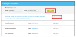 For the Employer Evaluations: Click Edit within the Worksite Supervisor box and enter that person’s name and email address. Click Send Invite to grant them access to provide your Employer Evaluations. Next to each type of evaluation you can track its status or click View Form.