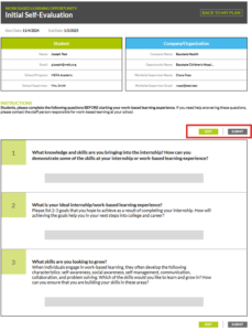 On the Initial Evaluation, click Edit to begin answering the three questions. You can save your answers as you go. Click Submit when you are done answering the questions. Note, submitting the form will lock it and prevent you from editing the form further.
